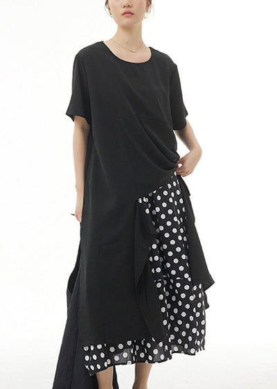 Modern Black O-Neck Ruffled Patchwork Cotton T Shirt Top Spring
