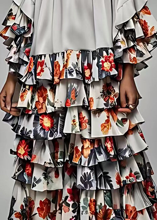 Italian Grey Layered Print Patchwork Silk Dress Butterfly Sleeve