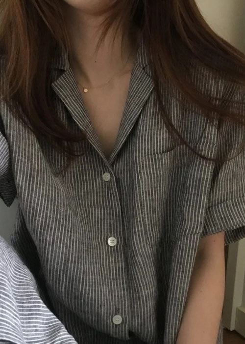 Fitted Black Striped Oversized Linen Maxi Dresses Short Sleeve