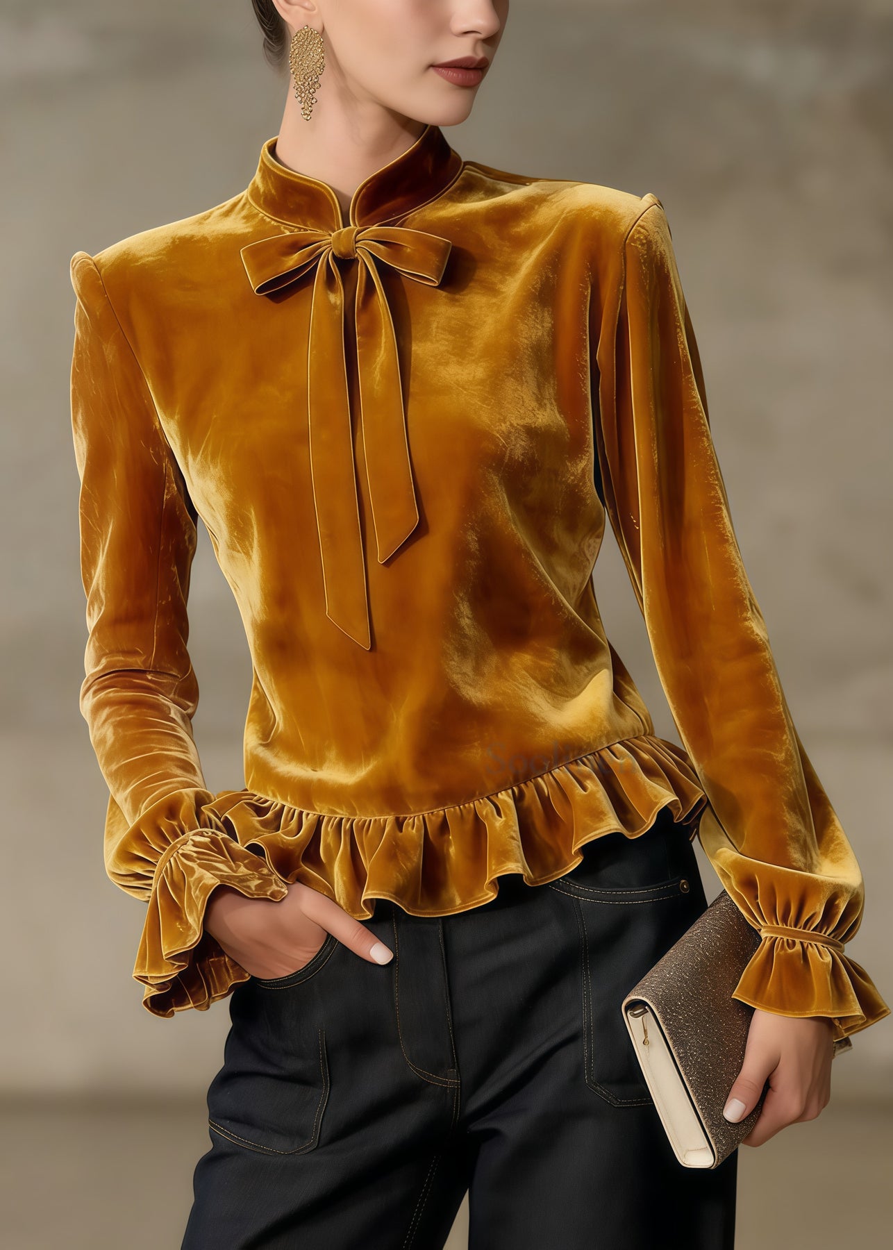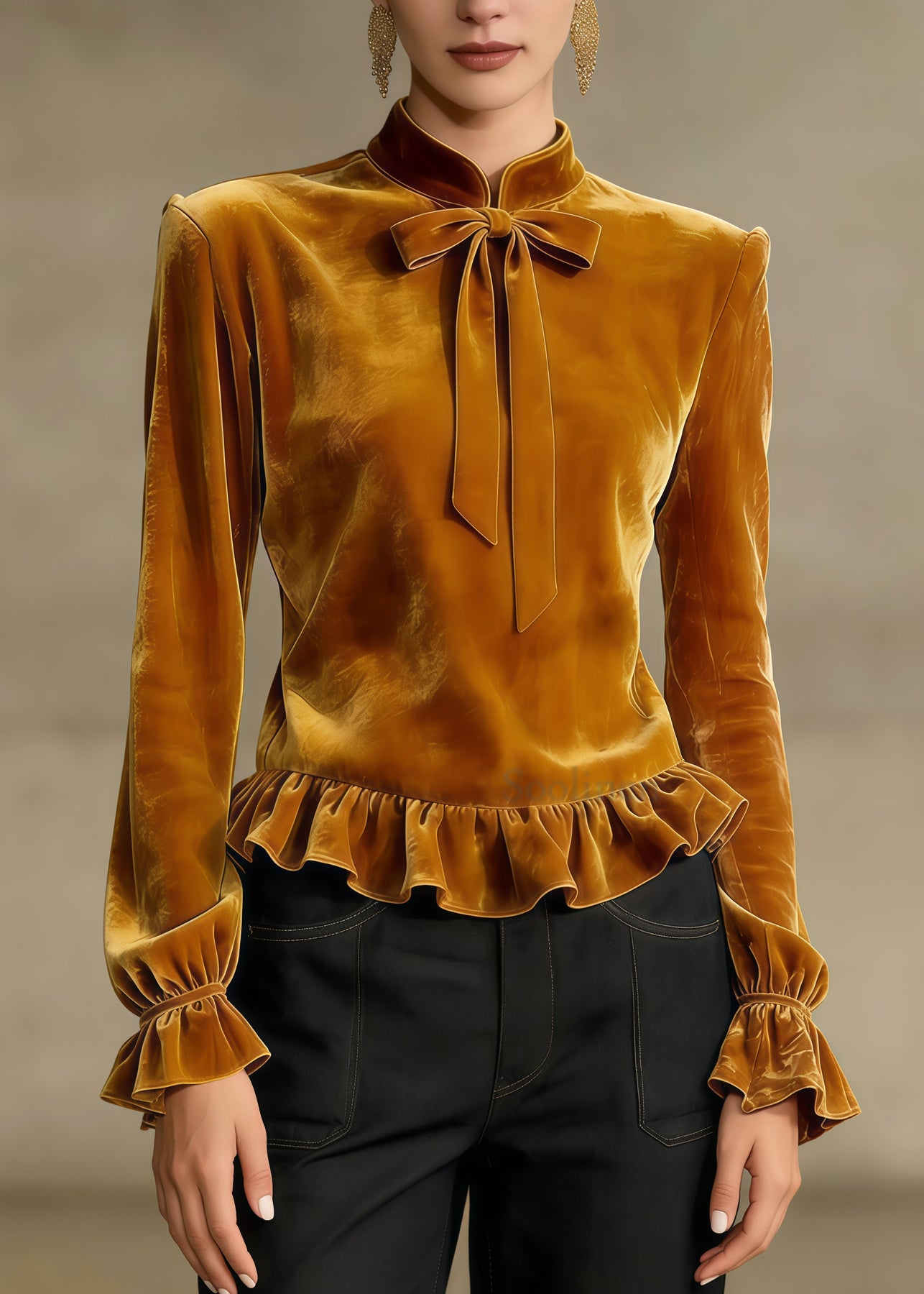 Art Golden Mandarin Collar Bow Ruffled Silk Velour Blouses Spring