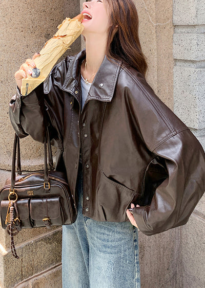 Handmade Brown Stand Collar Oversized Faux Leather Coats Spring