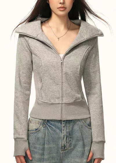 Women Grey Zip Up Pockets Casual Cotton Hoodies Outwear Fall
