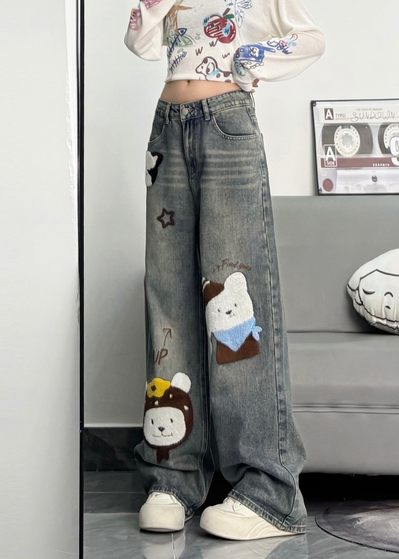 Cute Blue Embroidered Character Denim Pants Spring