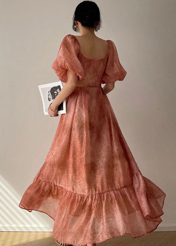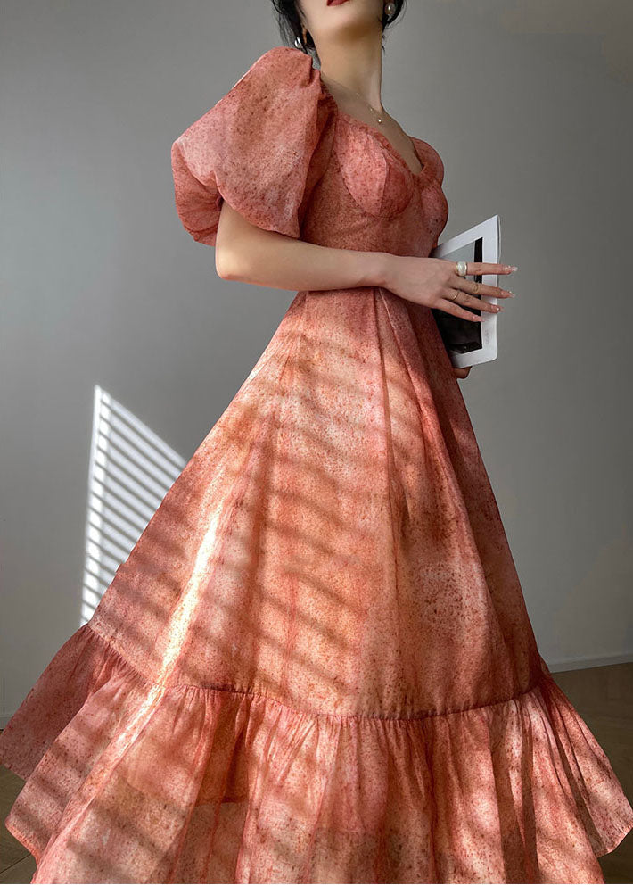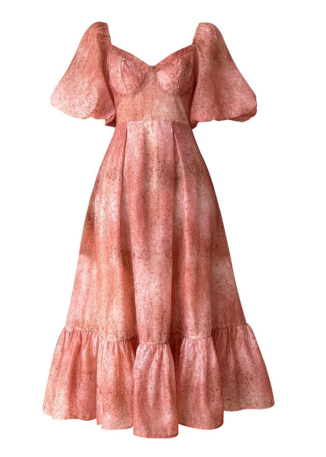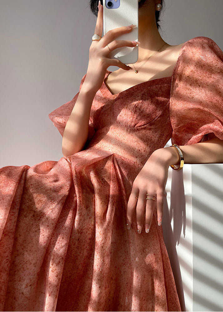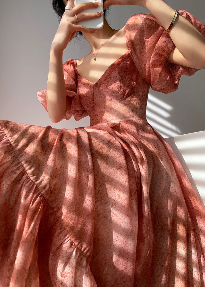 French Red V Neck Patchwork Bustier Silk Long Dresses Vestidos Puff Sleeve