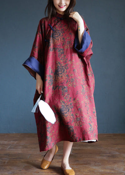 Plus Size Red Print Chinese Style Cotton Long Dress Spring