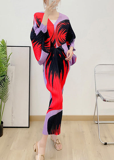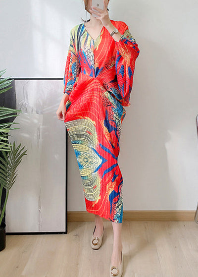Fashion Red V Neck Print Wrinkled Vestidos Dress Long Sleeve
