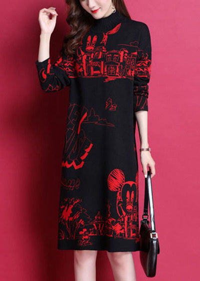Red Print Thick Knit Long Sweater Dress High Neck Long Sleeve