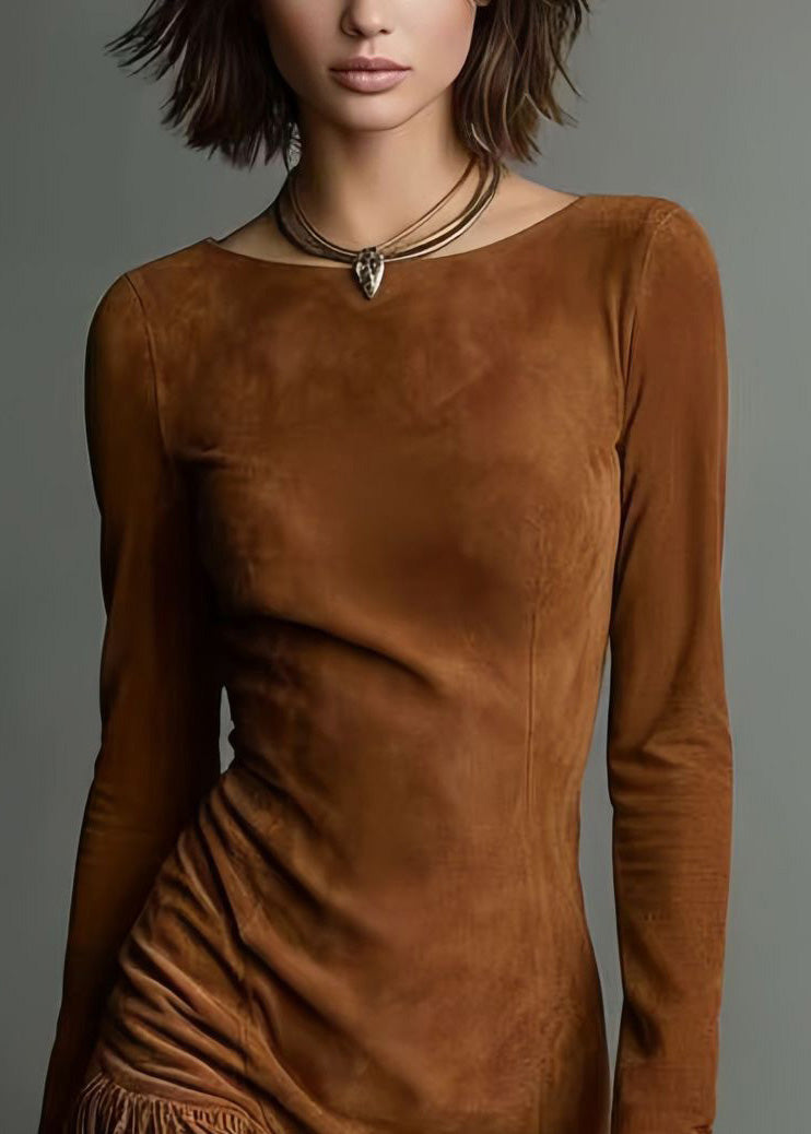 Style Brown O-Neck Tassel Faux Suede Mid Dresses Spring