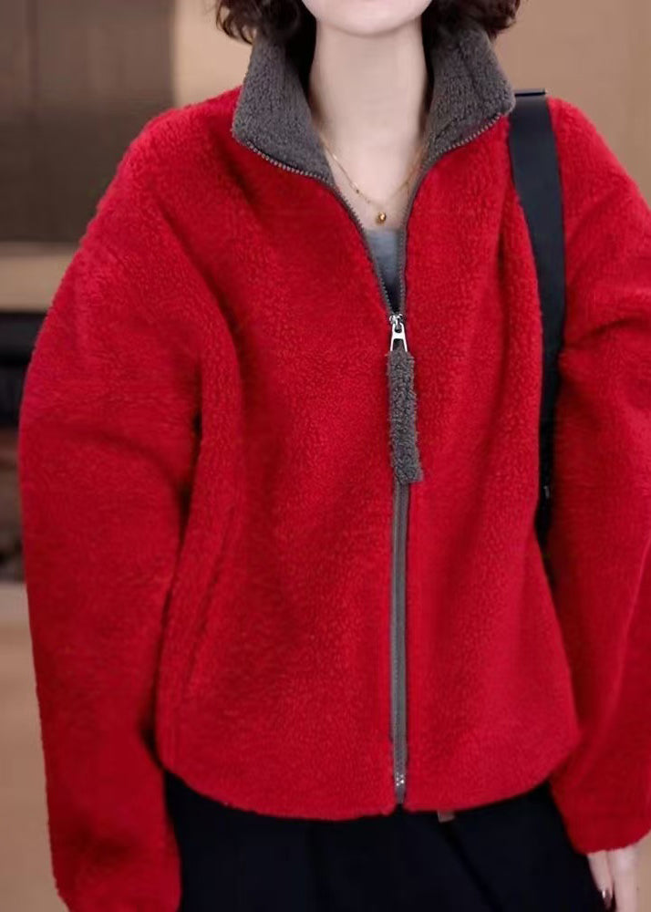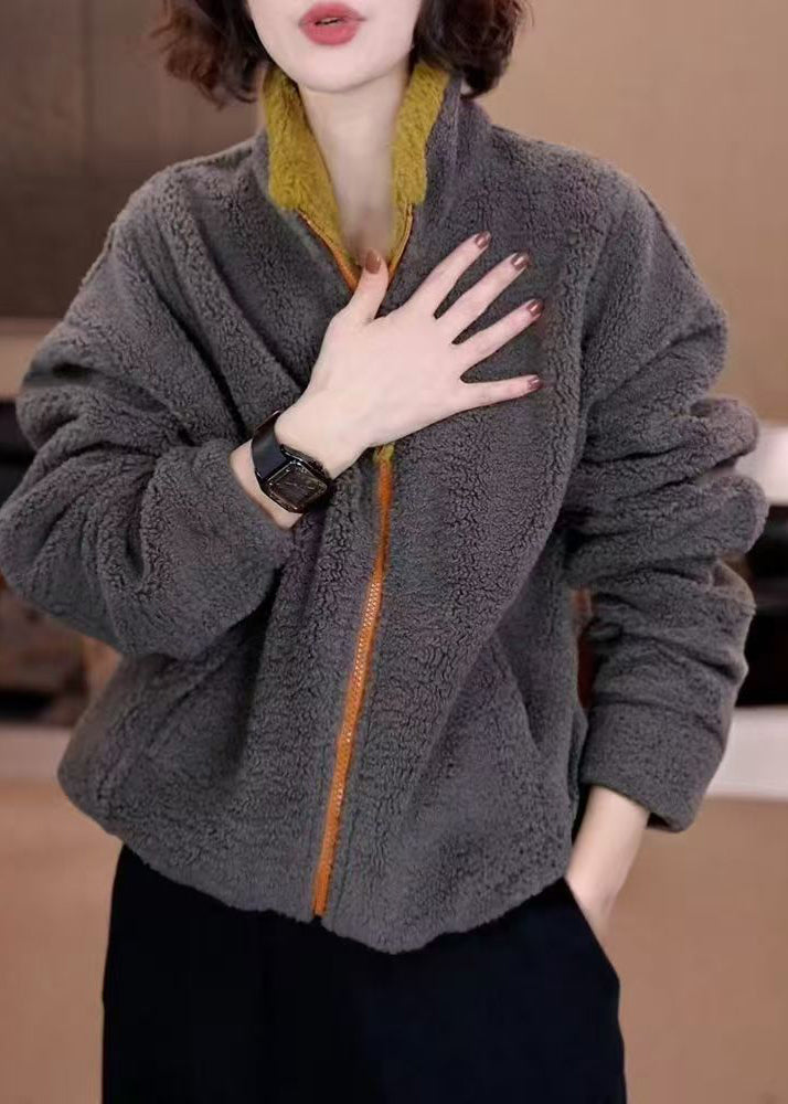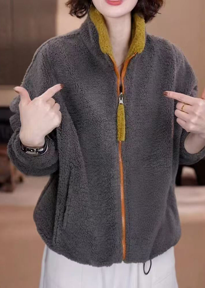 Loose Grey Zip Up Pockets Drawstring Fluffy Coat Spring