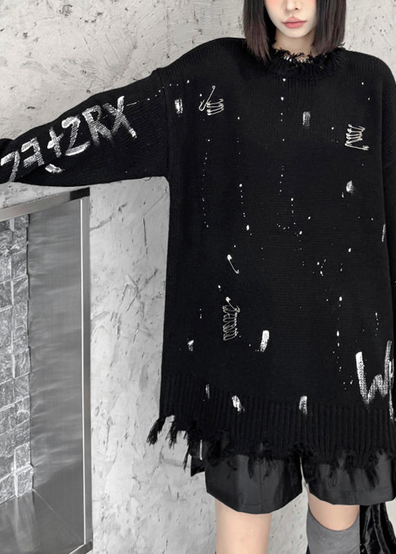 Fashion Black Graphic Hole Thick Cotton Knit Sweater Fall