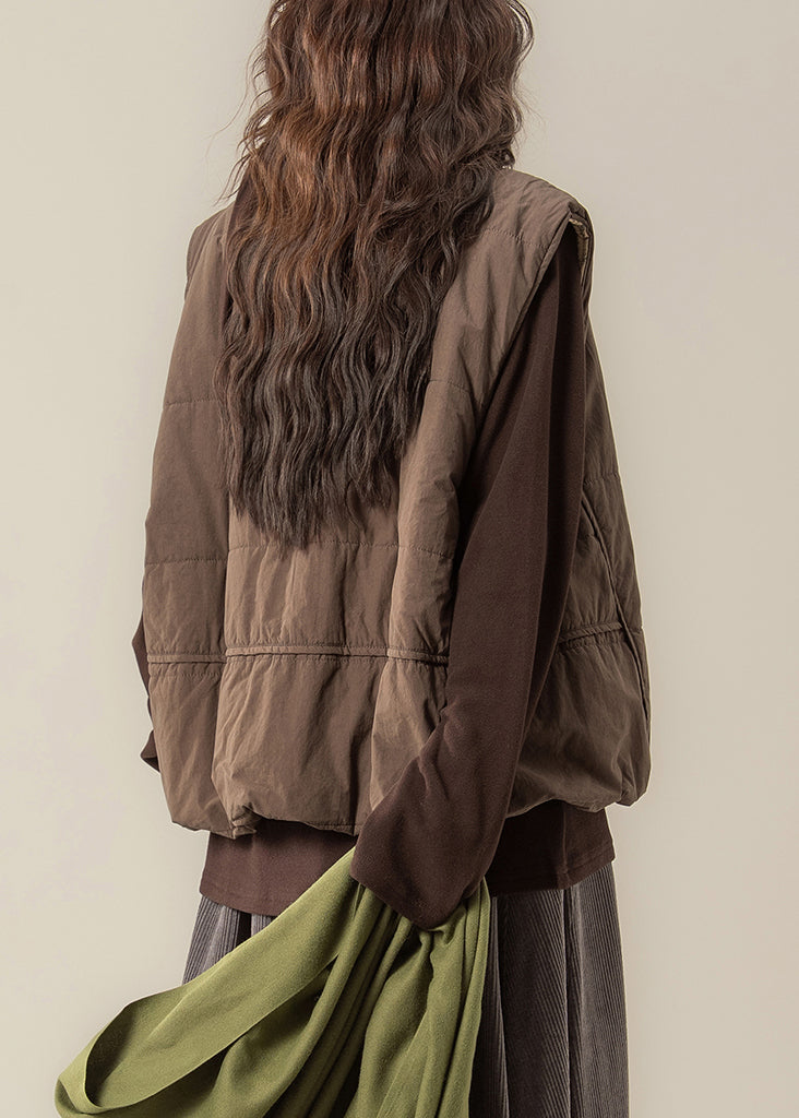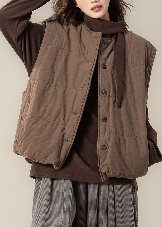 Loose Coffee O Neck Button Cotton Filled Two Piece Set Sleeveless