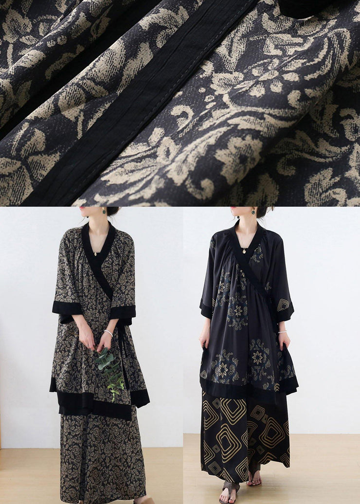 Natural Black Geometric Tie Waist Top Wide Leg Two Piece Suit Set - SooLinen