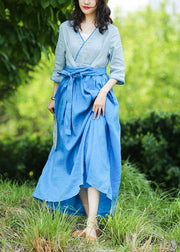 Natürliche V-Ausschnitt Patchwork Leinen Sommer Lange Hemden Muster blaue Kleider