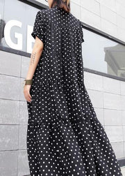 Women black dotted cotton dress stand collar Maxi summer Dress - SooLinen
