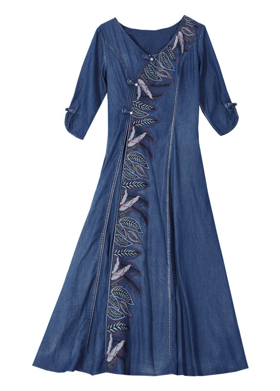 Stylish Blue V Neck Leaf Embroideried Cotton Denim Maxi Dress Half Sleeve