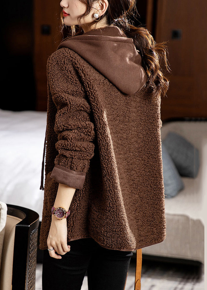Coffee Pockets Patchwork Coats Teddy Faux Fur Hooded Long Sleeve