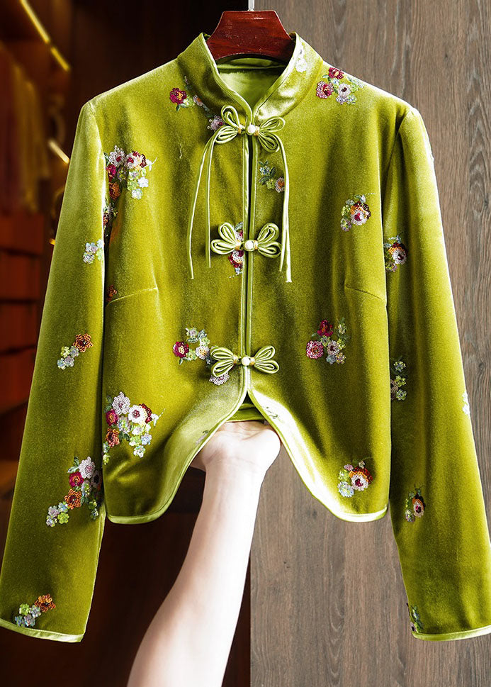 Chinese Style Green Embroideried Button Silk Velour Coats Long Sleeve