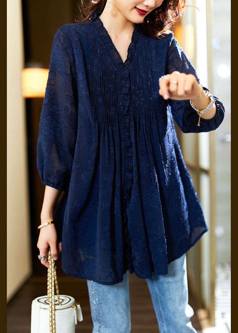 Classy Navy V Neck Ruffled Patchwork Chiffon Blouses Spring