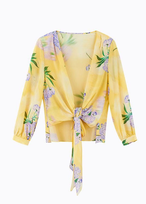 Elegant Yellow V Neck Wrinkled Print Patchwork Chiffon Top Spring