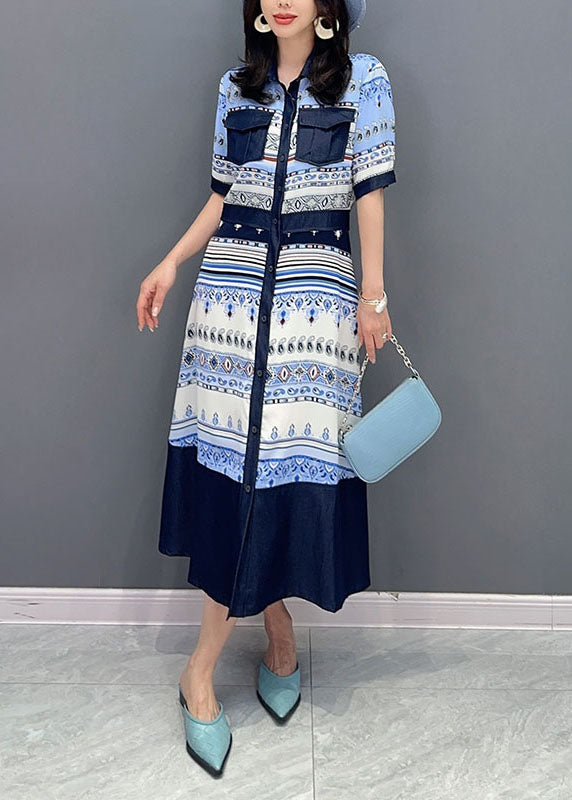 French Blue Peter Pan Collar Print Button Patchwork Cotton Shirts Dress Summer
