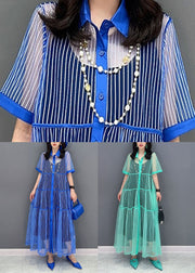 Light Green Patchwork Tulle Shirts Dress Peter Pan Collar Wrinkled Summer