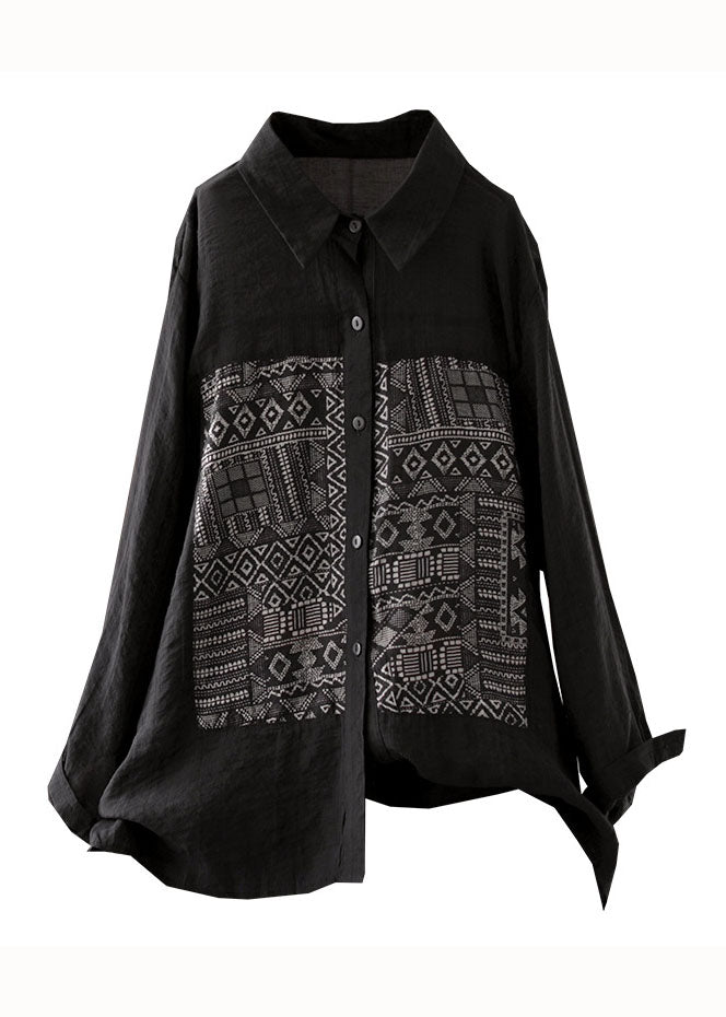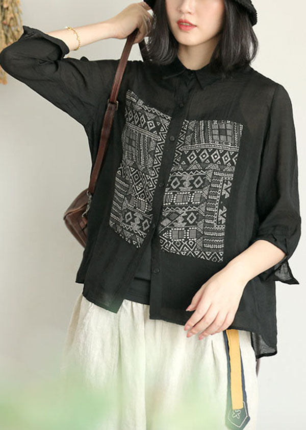 Women Black Peter Pan Collar Geometric Patchwork Linen Blouse Top Bracelet Sleeve