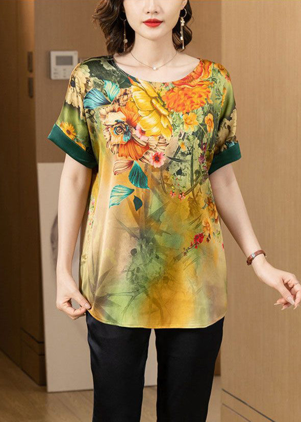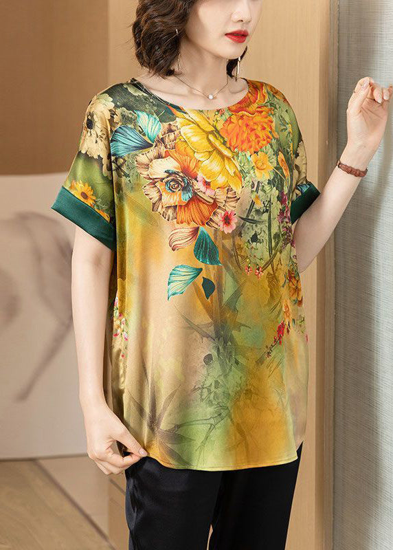 Loose Yellow O Neck Print Patchwork Silk T Shirt Summer