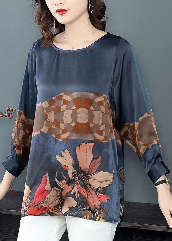 Women Navy O Neck Print Patchwork Silk Tops Fall