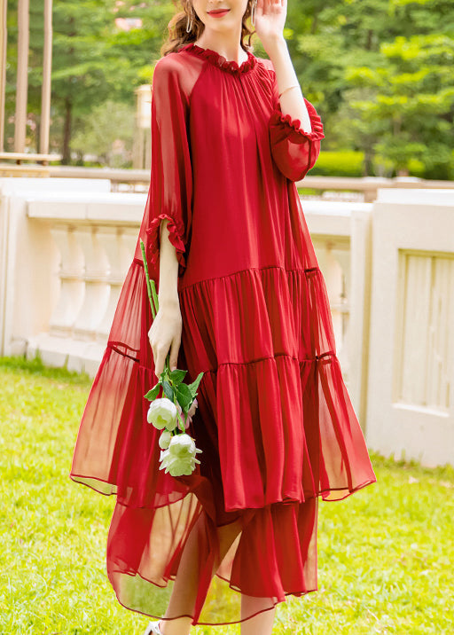 Organic Red Ruffled Patchwork Silk Long Dress Summer