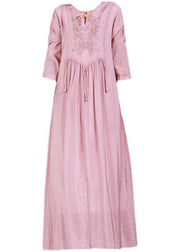 Art Pink Embroideried Wrinkled Linen Holiday Dress Bracelet Sleeve