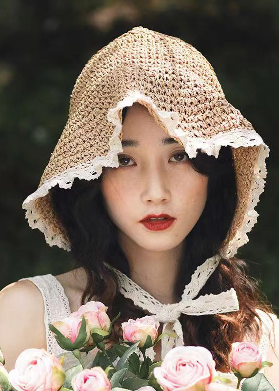 Women Beige Lace Patchwork Knit Blended Hollow Out Bucket Hat