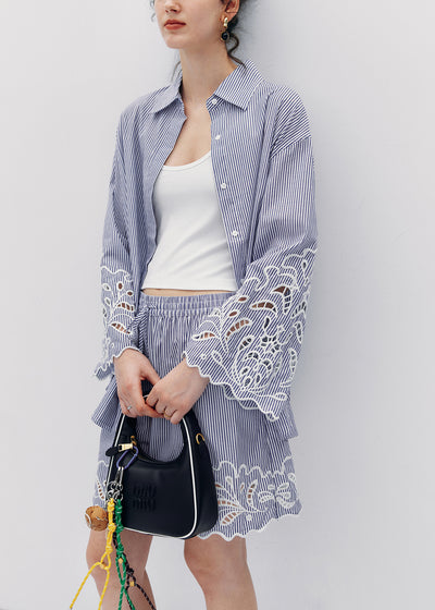 Fitted Blue Striped Hollow Out Embroidered Cotton Two Pieces Set Summer