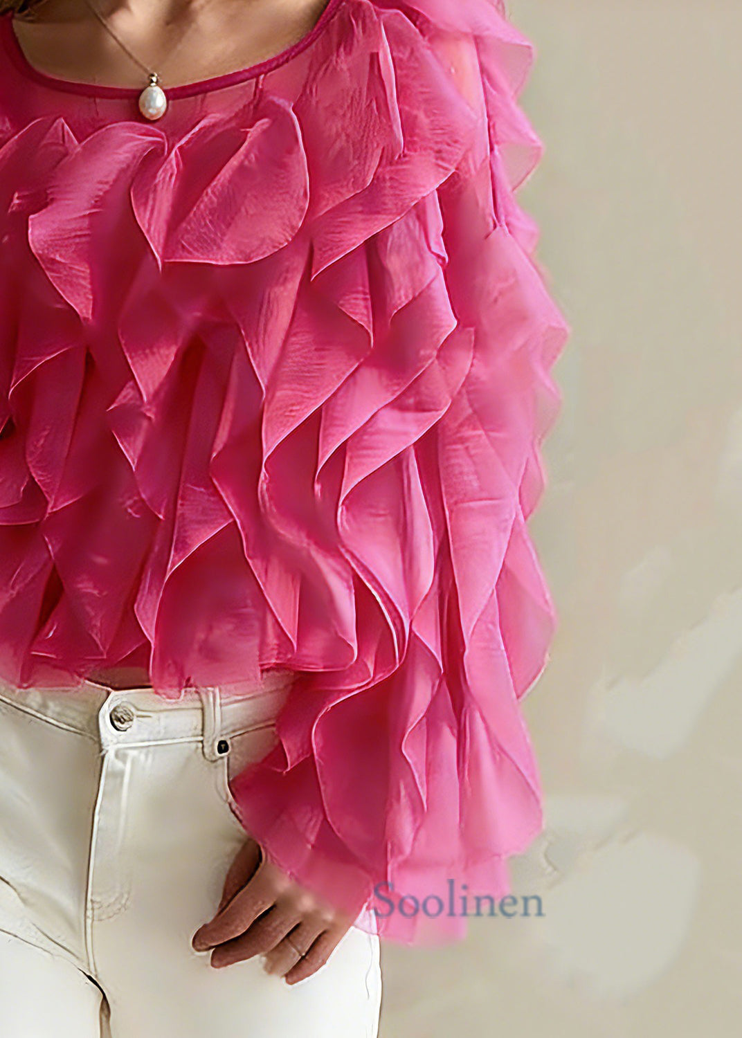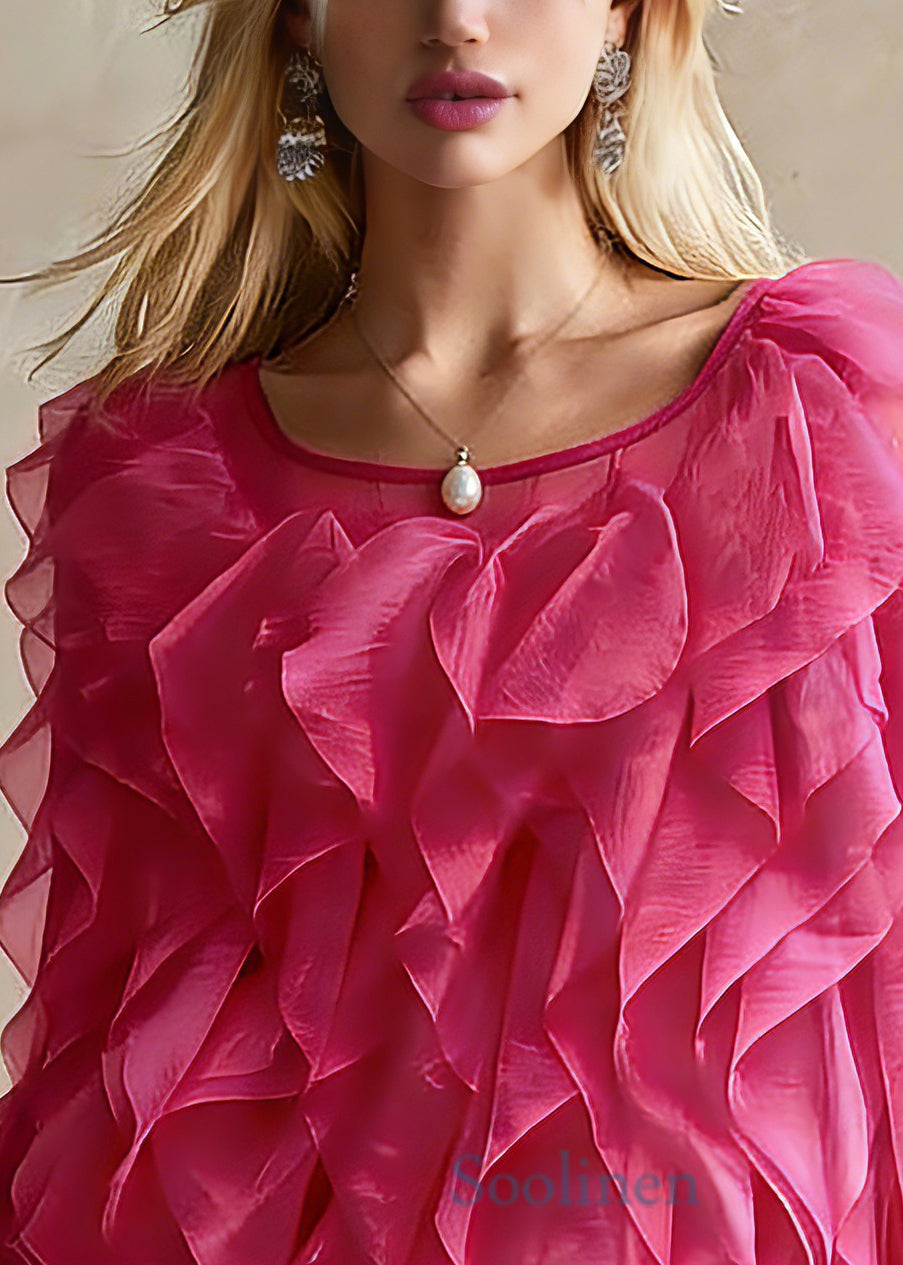 Bohemian Pink O-Neck Ruffled Chiffon Top Spring