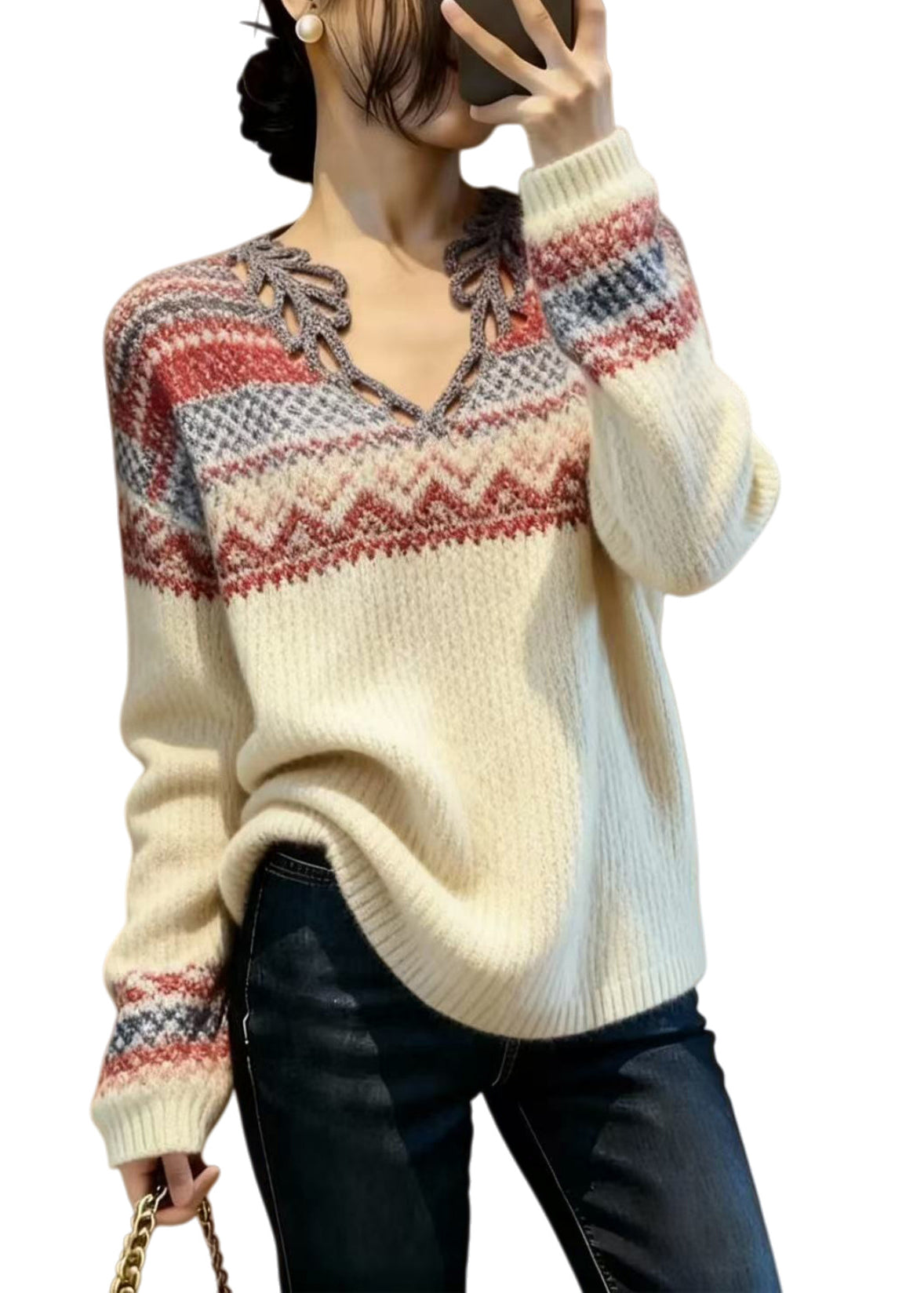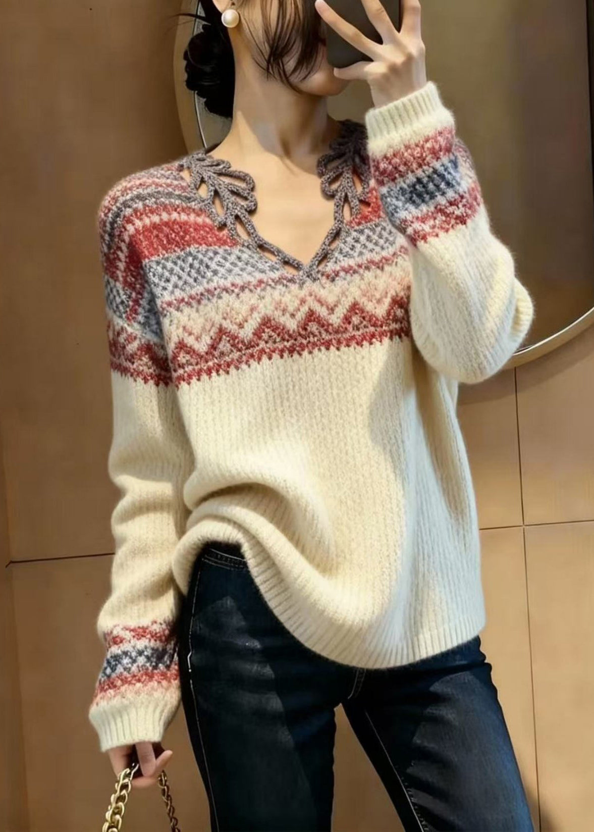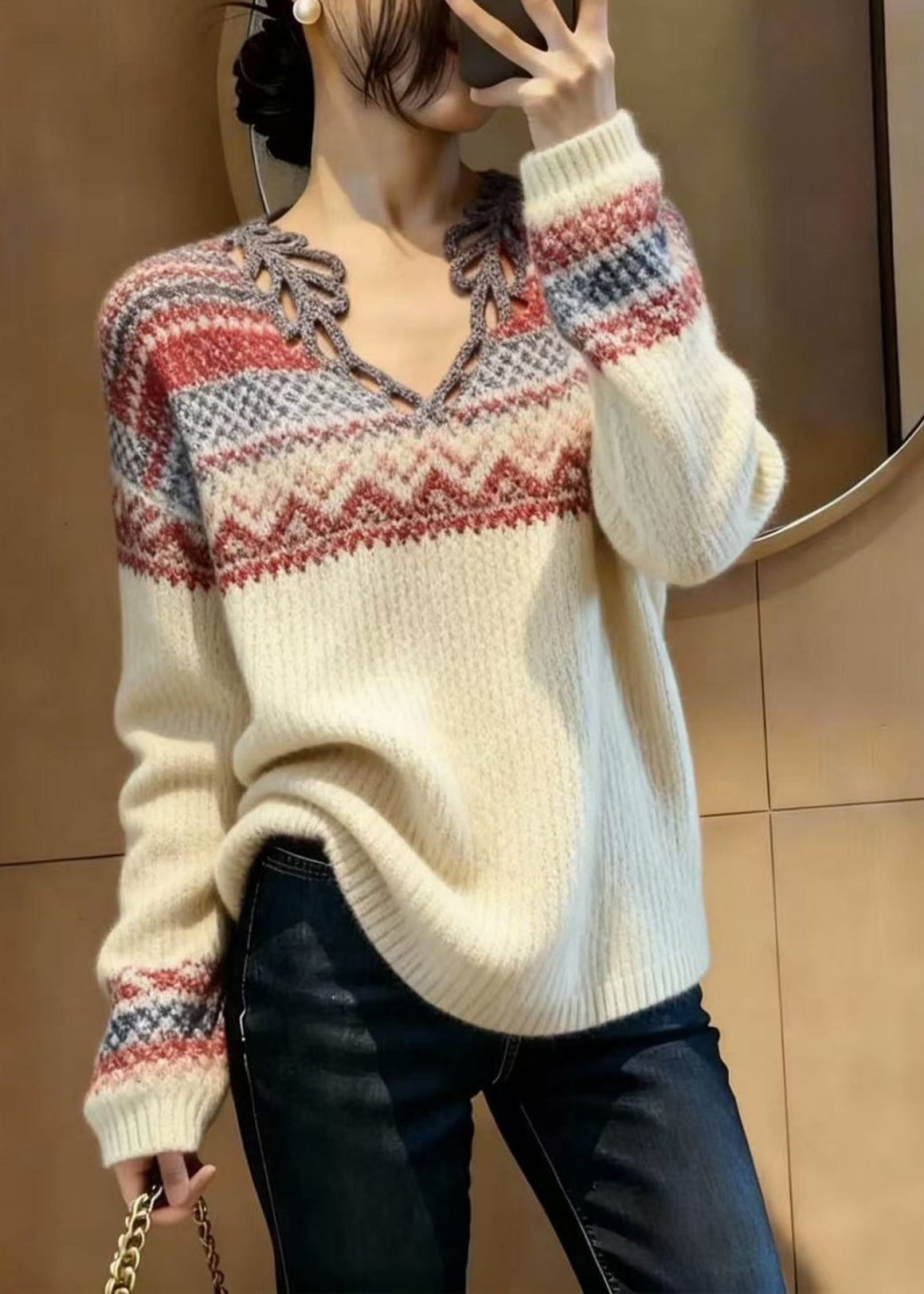 Elegant Beige V Neck Print Knitted Tops Spring