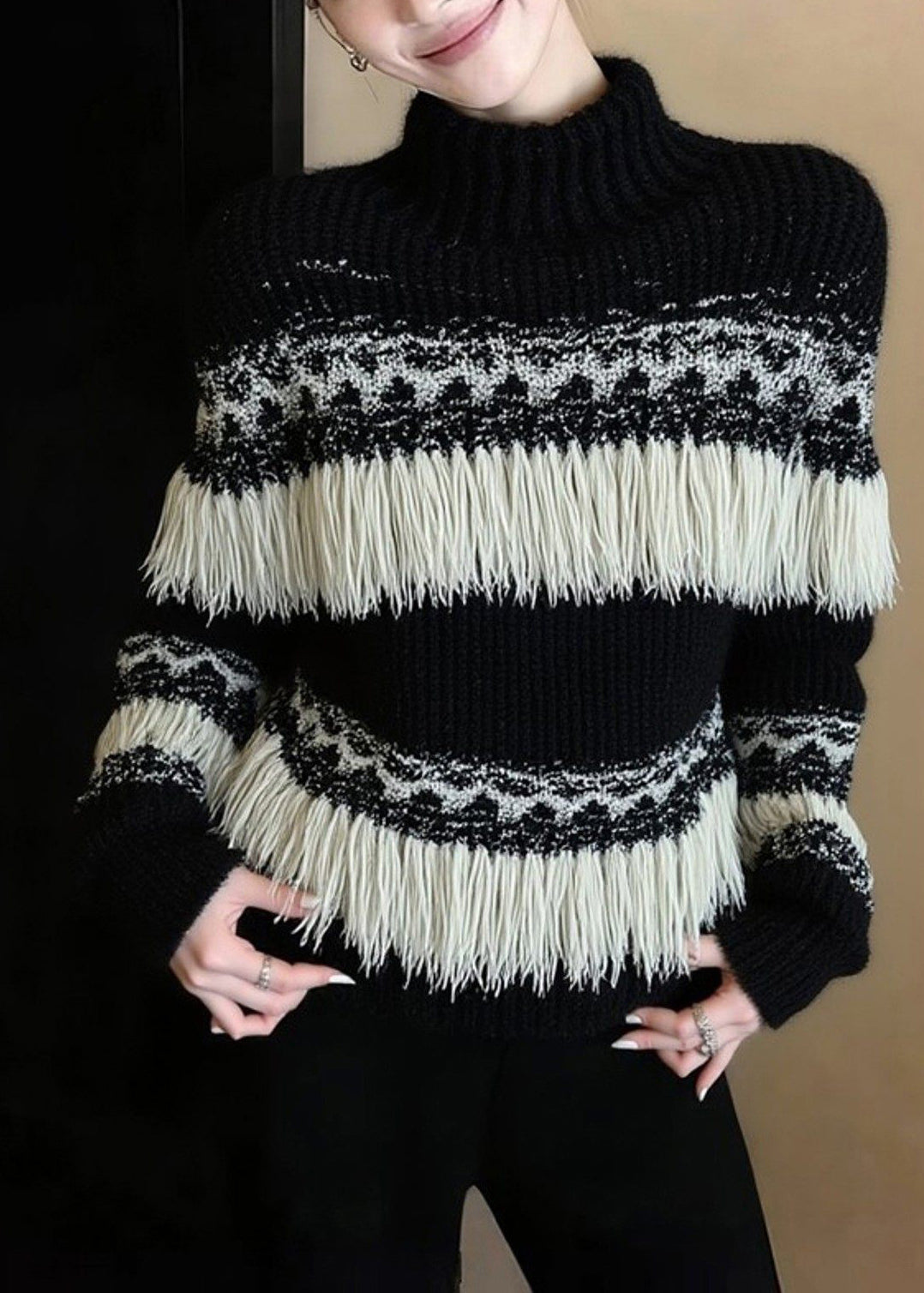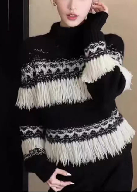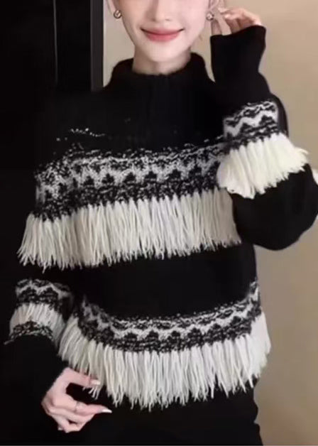 Fashion Black Tasseled Striped Knit Pullover Winter