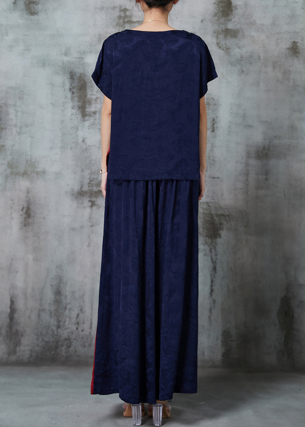 Navy Jacquard Silk Oriental 2 Piece Outfit Tasseled Embroidered Summer