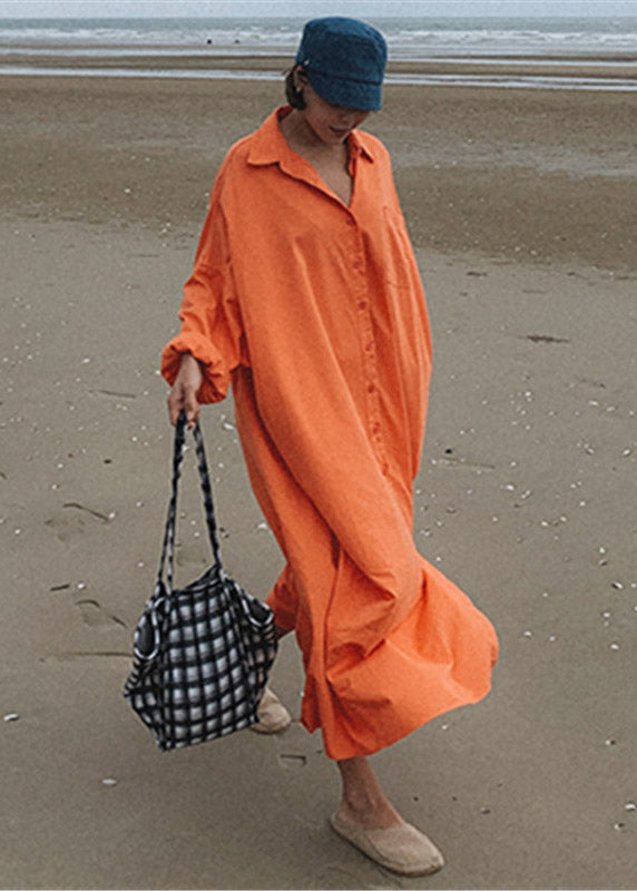 Loose Orange Peter Pan Collar Button Pockets Cotton Dress Long Sleeve