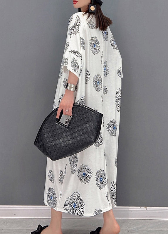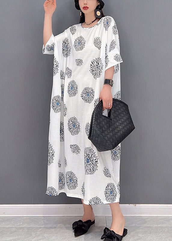 Plus Size White O-Neck Print Long Dress Half Sleeve