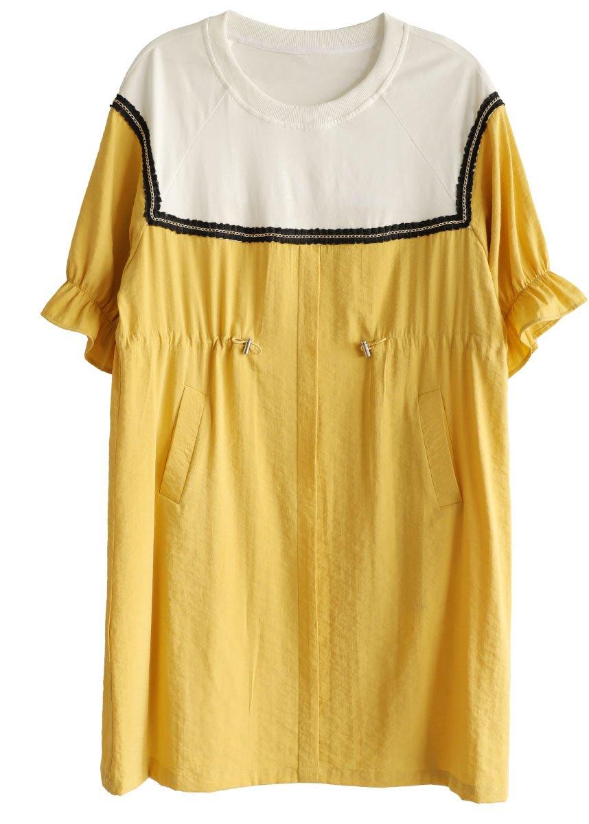 Casual Yellow Tie Waist Pockets Patchwork Summer Vacation Dress Half Sleeve
