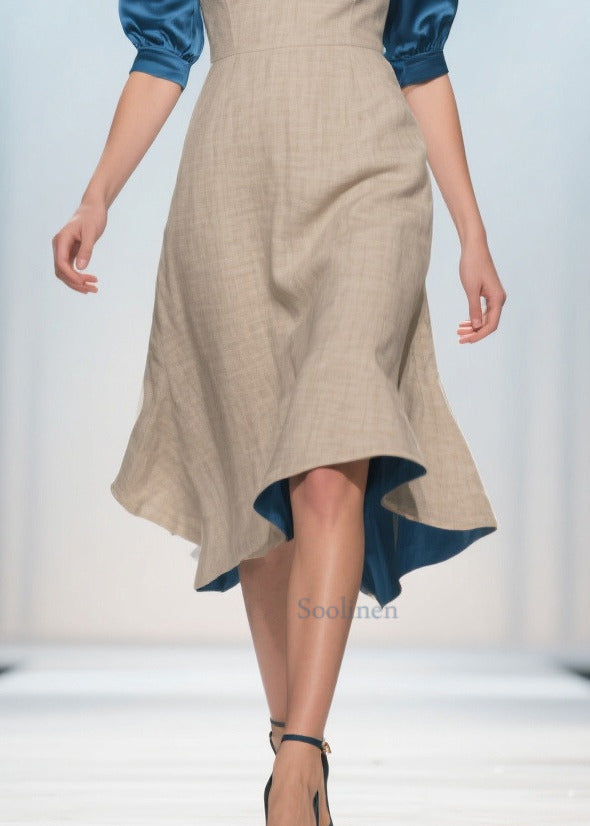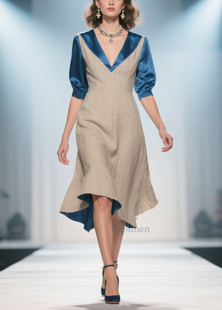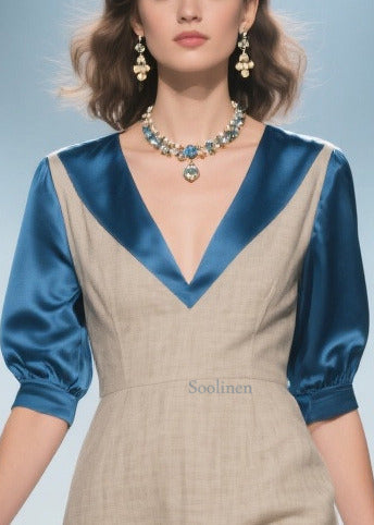 Elegant Apricot V Neck Patchwork Linen Silk Fake Two Piece Dress Summer