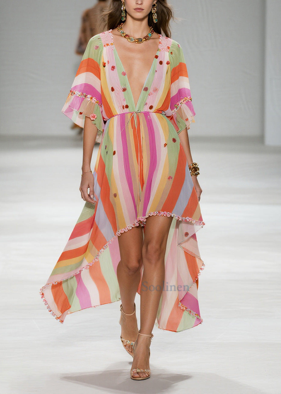 Rainbow Striped Chiffon Party Dress Ruffled Low High Design Summer