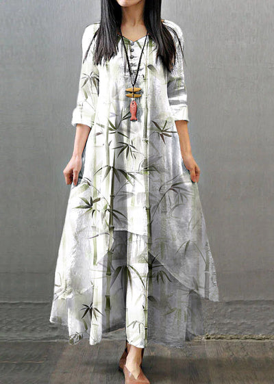 Women Long Sleeve Double Layers Button Asymmetric White bamboo Maxi Dress