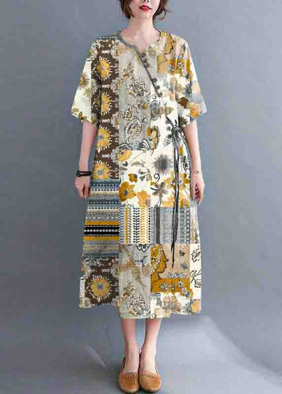 Loose Yellow geometry Button Maxi Summer Chiffon Dress