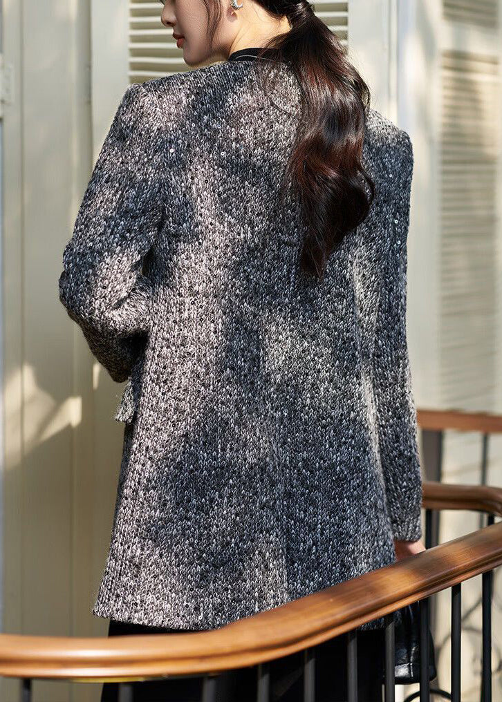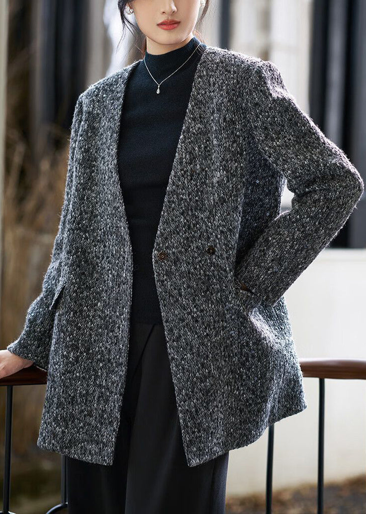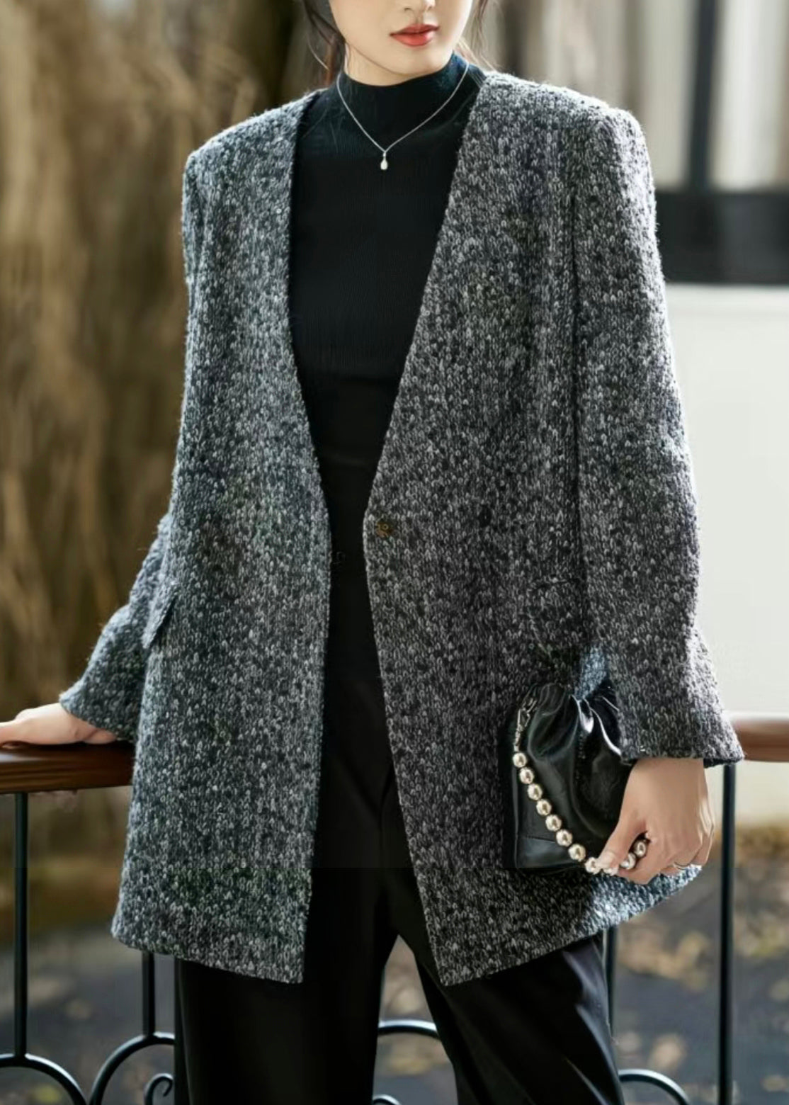 Art Grey V Neck Button Pockets Woolen Coat Fall