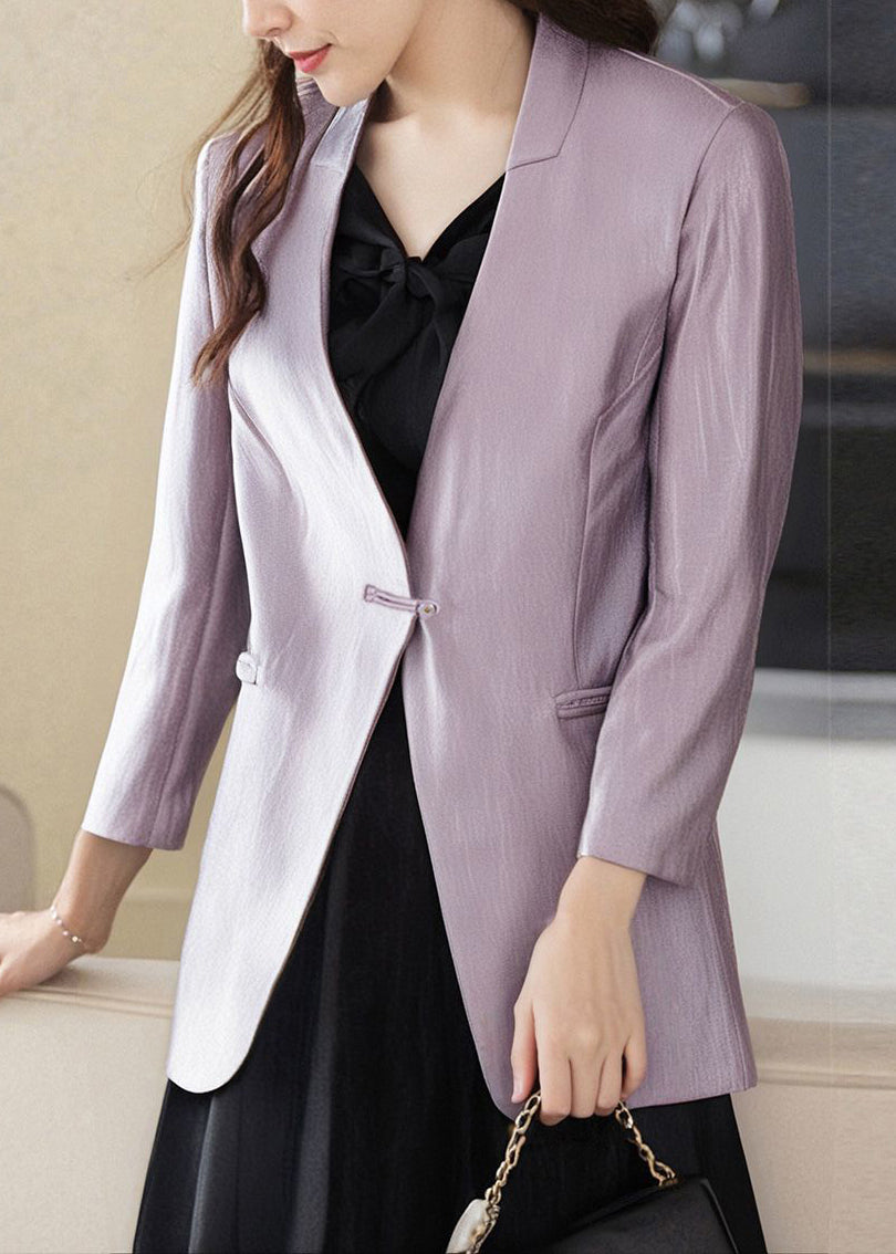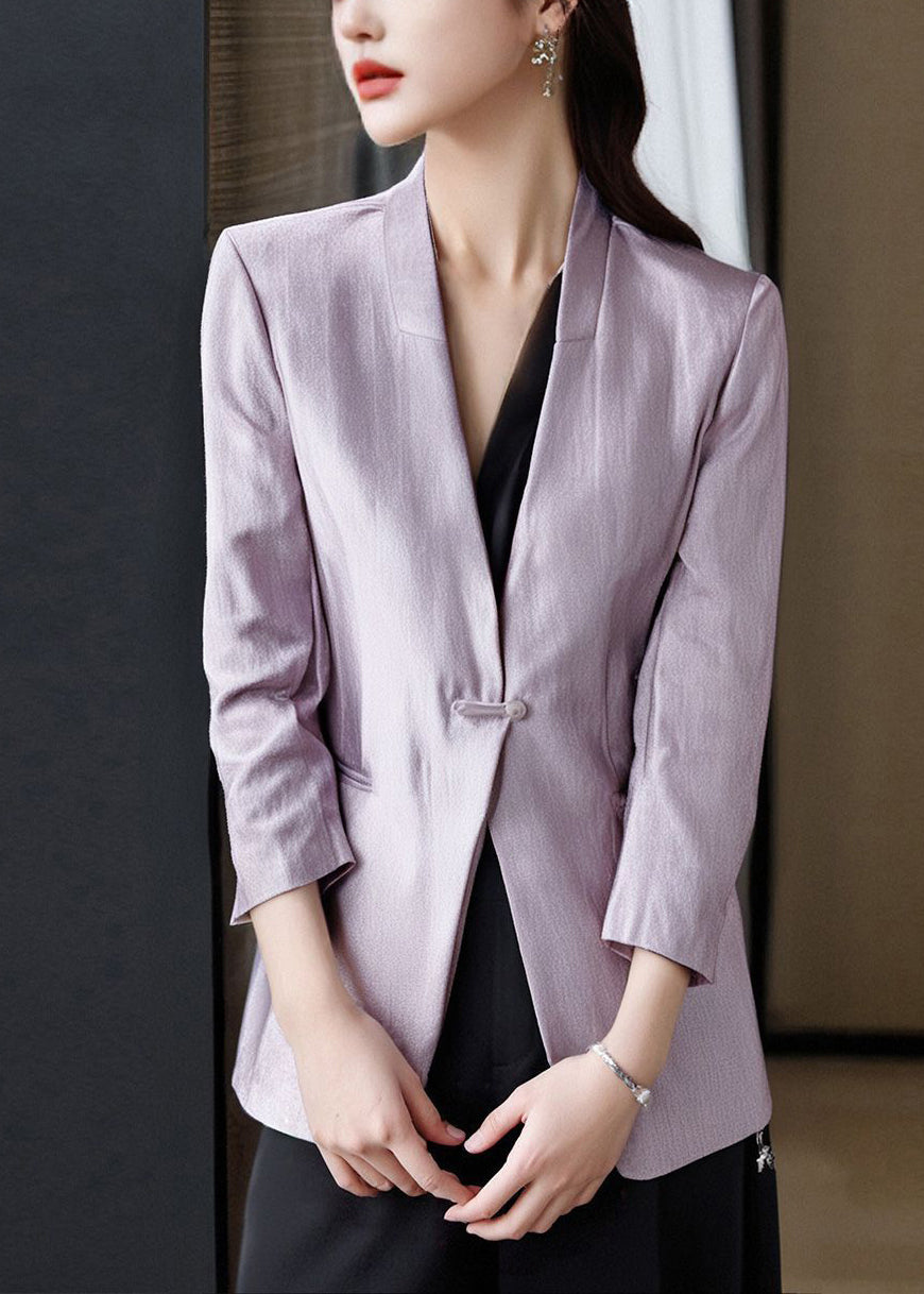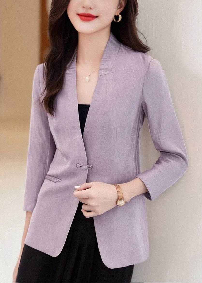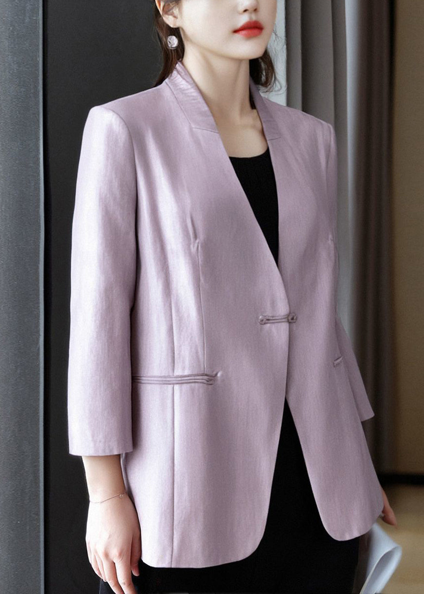 Casual Purple V Neck Button Pockets Cotton Coats Bracelet Sleeve