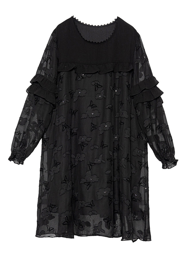 Boho Black Embroideried Patchwork Ruffles Chiffon Maxi Dresses Spring