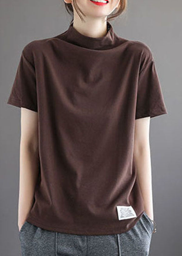 Coffee Patchwork Cotton T Shirt Top Hign Neck Half Sleeve