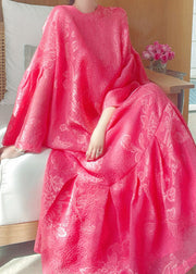 Jacquard Red O-Neck Silk Maxi Dress Flare Sleeve