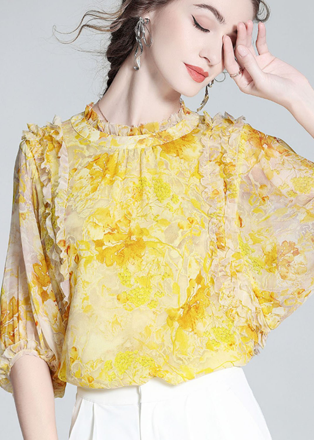 Bohemian Yellow Ruffled Print Silk Blouse Tops Bracelet Sleeve