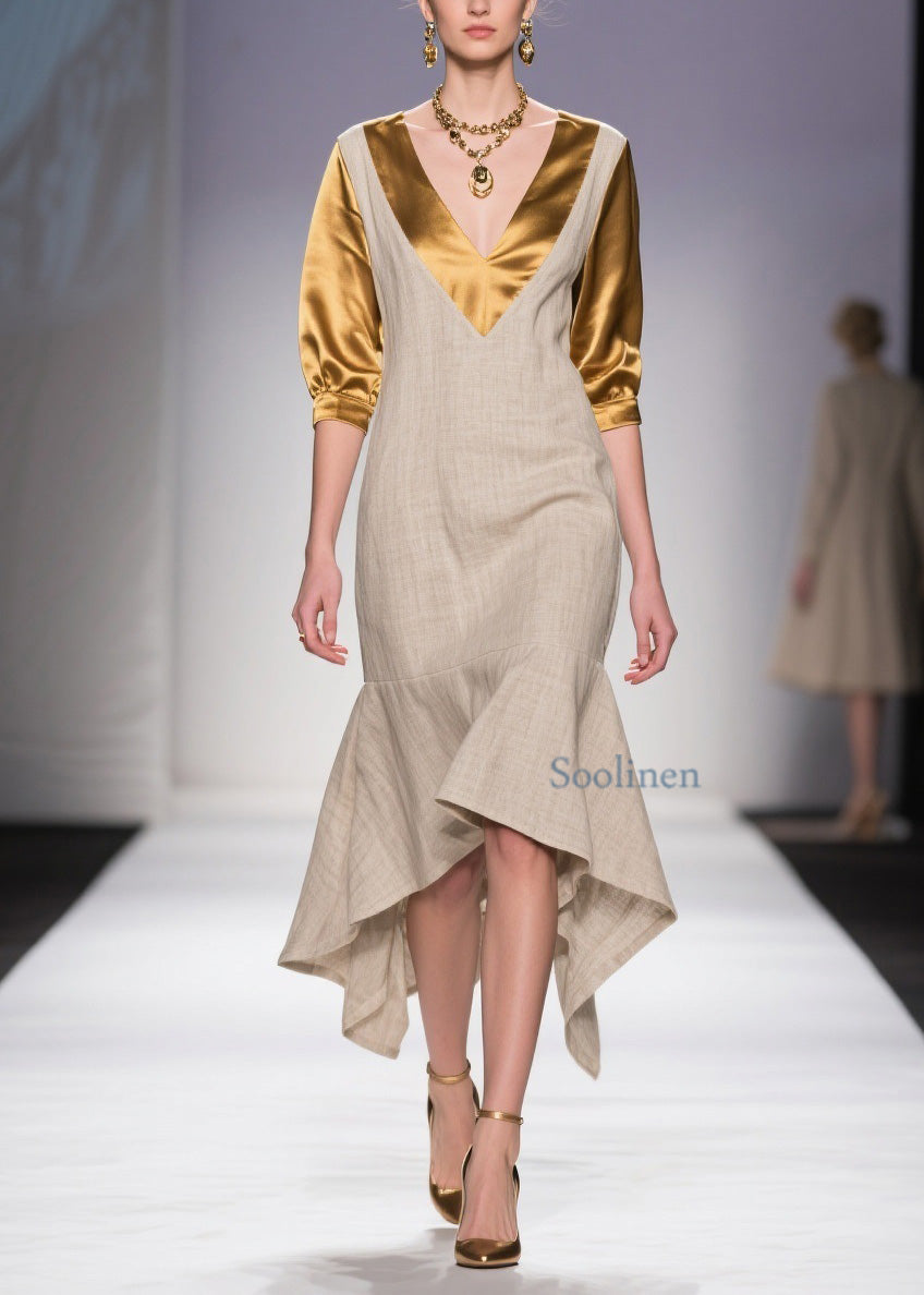 Classy V Neck Asymmetrical Patchwork Linen Silk Dress Summer